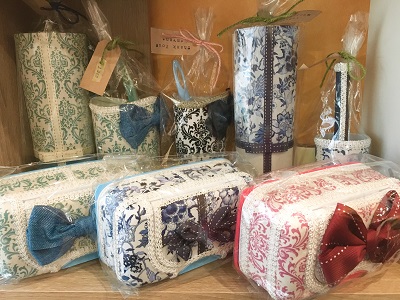 木やプラスチックの入れ物や雑貨に上質な布やリボンを貼り付け、デコレーションし